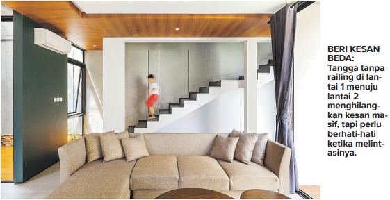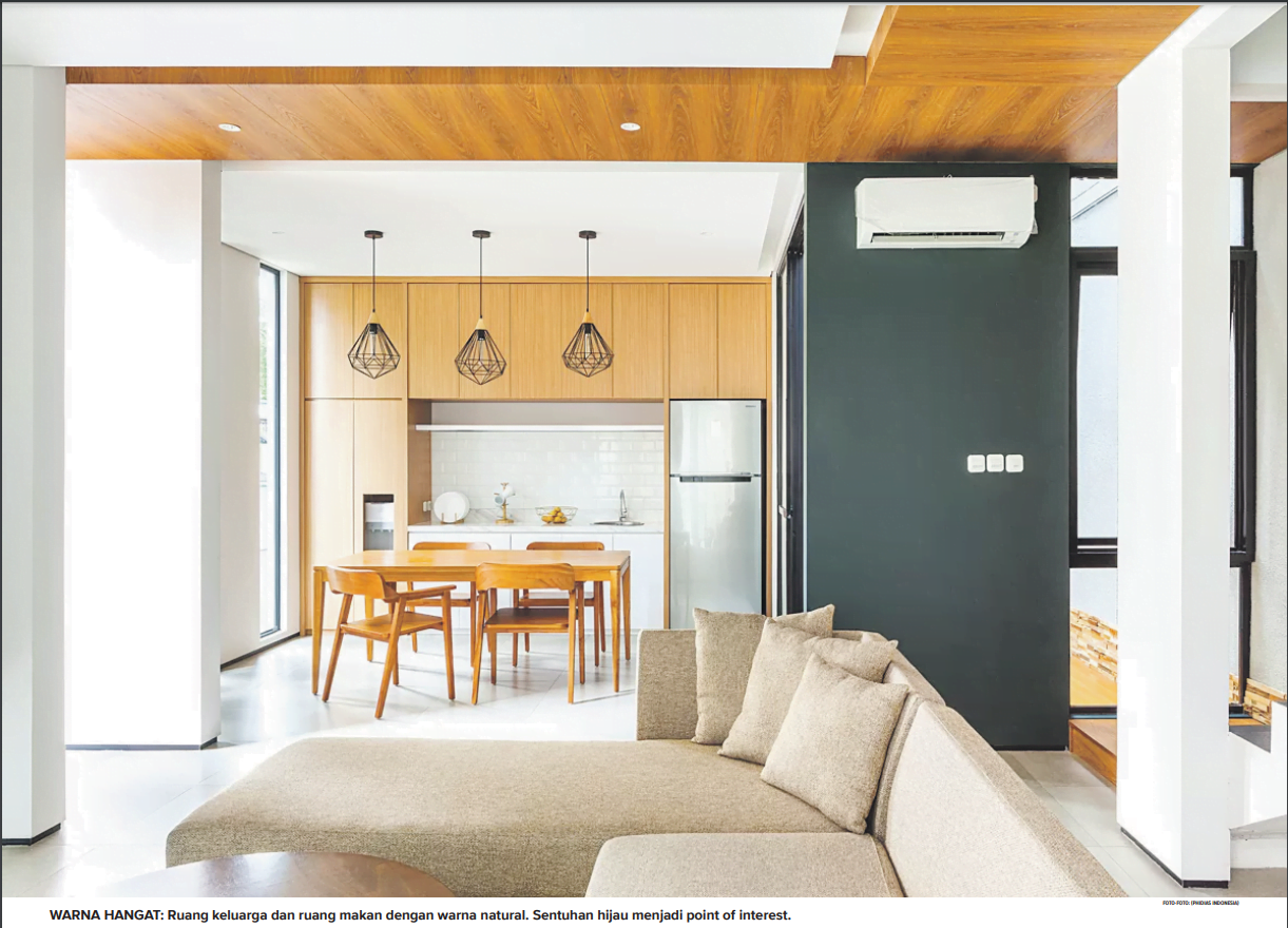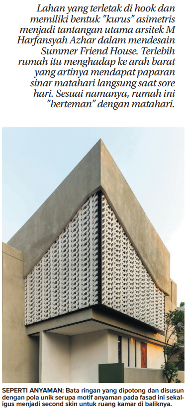’’Taman itu kami tutup dinding warna hijau, sehingga aktivitas pemilik tidak terlihat oleh orang luar dan begitu pula sebaliknya,’’ katanya. Sementara itu, untuk mengatasi masalah lahan yang menghadap ke arah barat, Harfansyah membuat fasad yang cenderung tertutup. Namun dia menciptakan lubang-lubang sebagai tempat masuknya udara dan penyaring cahaya menggunakan dua material utama. Yakni roster dan batu bata ringan. Roster menjadi material fasad kotak yang menutup area servis pada bagian depan. Sedangkan bata ringan dipotong dan disusun sedemikian rupa agar memiliki motif seperti anyaman dan lubang-lubang yang beraturan. Dinding bata ringan itu berfungsi sebagai second skin, terutama pada area kamar utama di lantai dua. Di baliknya terdapat jendela kaca yang bisa dibuka tutup. ’’Dari dalam rumah akan muncul bayangan cantik dari second skin itu. Rumah juga menjadi tidak begitu silau karena cahaya telah tersaring,’’ katanya. Harfansyah menerapkan warna yang cenderung netral pada rumah ini, baik eksterior maupun interior. Untuk fasad terdapat tiga warna utama, yakni abu-abu kamprot, putih dan hijau. Sebab, dia ingin rumah ini tetap downto-earth. ’’Bentuk rumah ini sudah cukup berbeda dari sekitarnya. Oleh karena itu, kami tidak mau menambah keanehan dari segi warna. Dengan begini pun sudah cukup eye-catching,’’ tandasnya. (adn/nor)